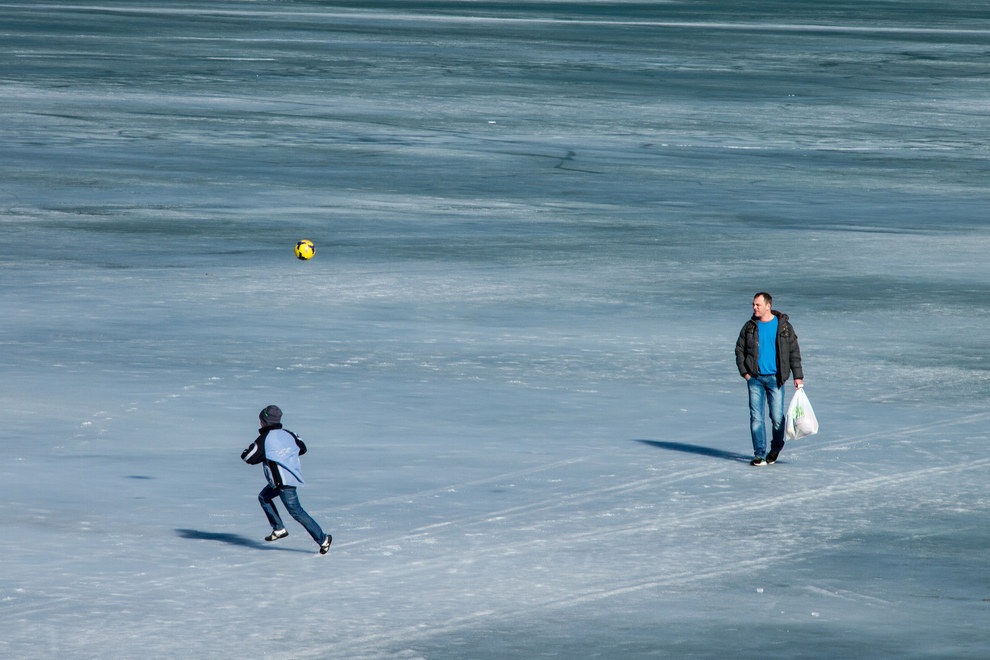 Ένας μπαμπάς κλωτσάει με τον γιο του μια μπάλα ποδοσφαίρου στη Μόσχα.
