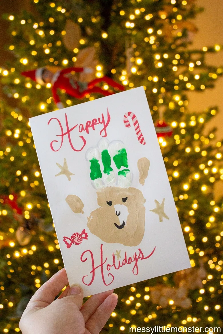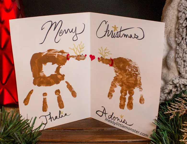 Αυτή η χριστουγεννιάτικη κάρτα με αποτύπωμα ταράνδου είναι ιδανική αν θέλετε να τη φτιάξετε με δύο παιδιά, καθώς το καθένα μπορεί να δημιουργήσει τον δικό του τάρανδο με ένα αποτύπωμα χεριού. Φυσικά, μπορεί να γίνει και με ένα παιδί, απλώς θα χρειαστεί να δημιουργήσει δύο αποτυπώματα. Η συγκεκριμένη κάρτα φτιάχνεται με το χαρτόνι ανοιχτό.