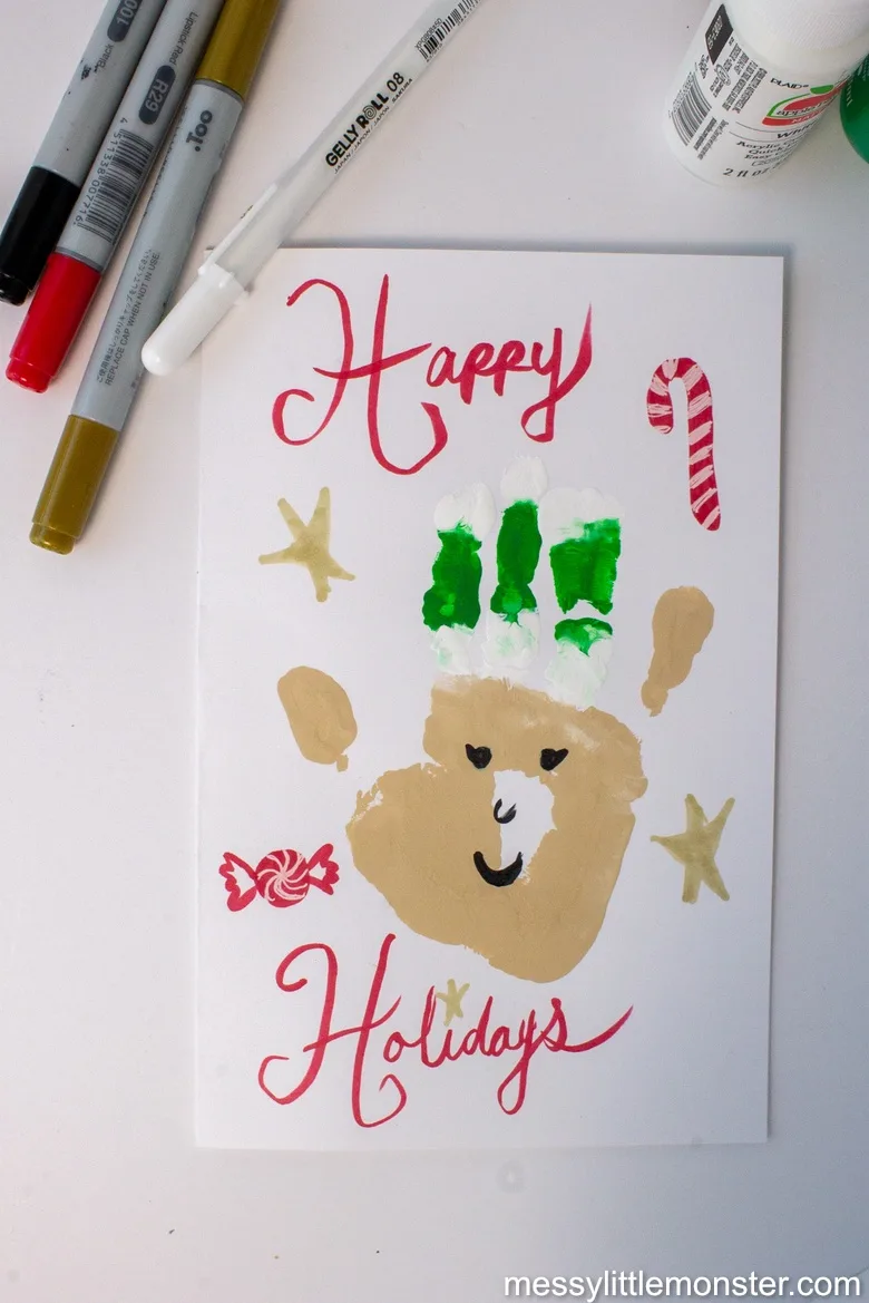 Βήμα 3: Προσθέστε λεπτομέρειες στην κάρτα με αποτύπωμα ξωτικού: Ολοκληρώστε το αποτύπωμα προσθέτοντας χαρακτηριστικά προσώπου στο τμήμα που έχει βαφτεί στο χρώμα του δέρματος. Στη συνέχεια, δώστε περισσότερες λεπτομέρειες στη χριστουγεννιάτικη κάρτα γράφοντας μια ευχή και προσθέτοντας σχέδια όπως αστέρια και γλυκά με χριστουγεννιάτικο θέμα.