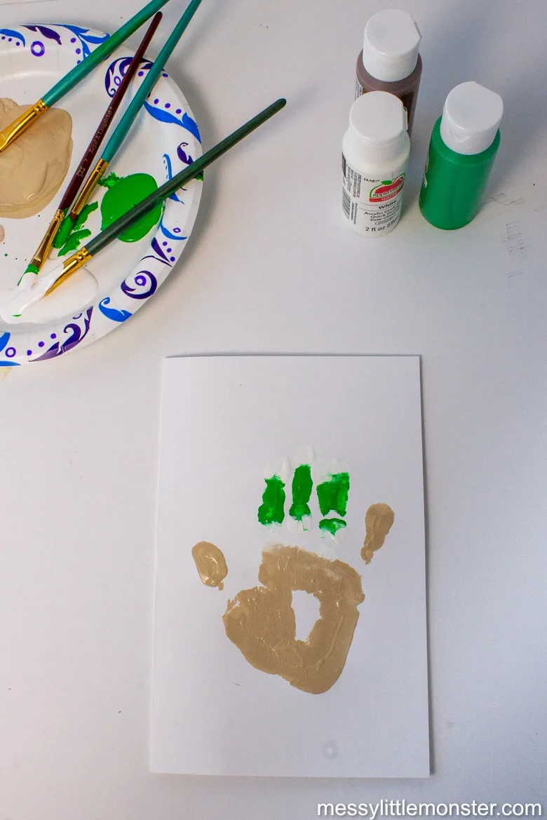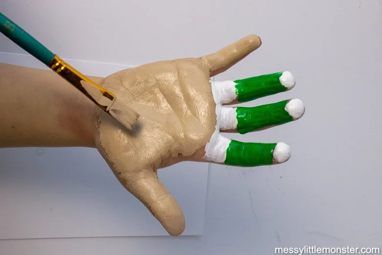 Βήμα 1: Βάψτε το χέρι του παιδιού: Βάψτε την παλάμη του παιδιού με χρώμα στο χρώμα του δέρματος. Βάψτε τον αντίχειρα και το μικρό δάχτυλο στο ίδιο χρώμα. Στη συνέχεια, βάψτε τα τρία μεσαία δάχτυλα πράσινα, προσθέτοντας μια λευκή γραμμή στην κορυφή και στη βάση τους. Κινηθείτε γρήγορα ώστε το χρώμα να μη στεγνώσει.