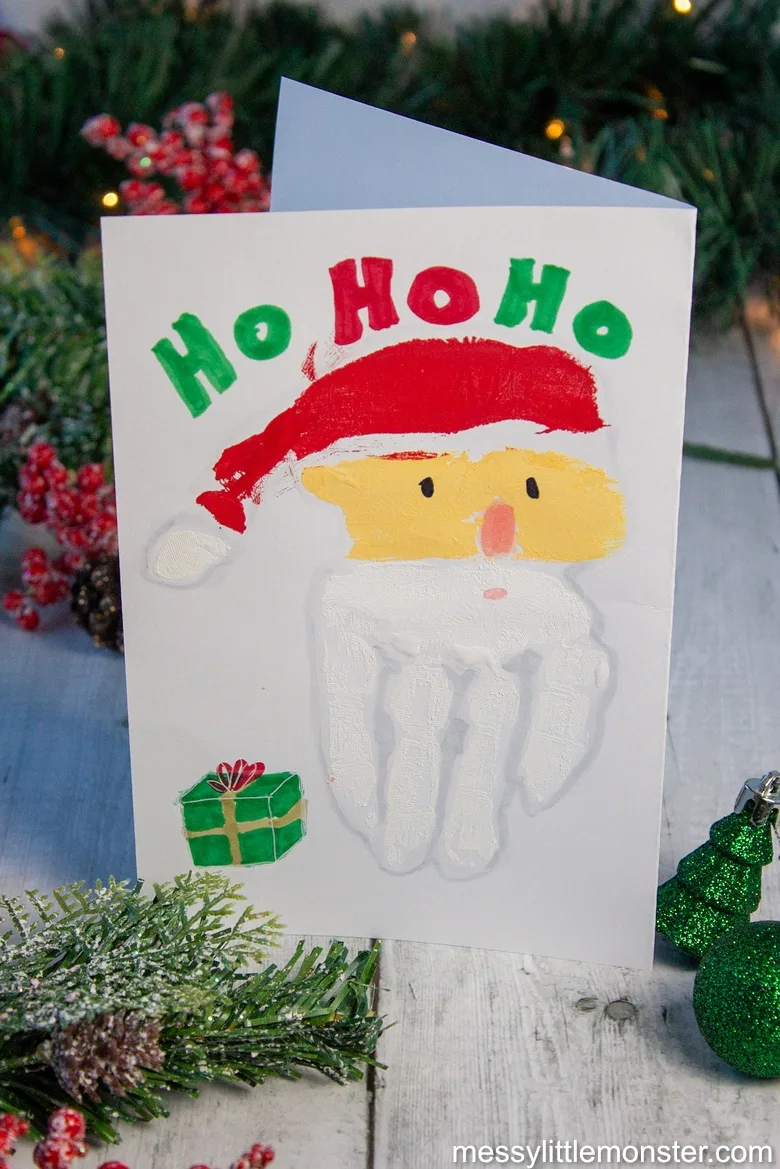 Βήμα 3: Προσθέστε λεπτομέρειες: Για να ολοκληρώσετε το αποτύπωμα, χρησιμοποιήστε μαρκαδόρους για να προσθέσετε μάτια, μύτη και ένα μικρό στόμα πάνω στη γενειάδα του Άγιου Βασίλη. Γράψτε «ho, ho ho» ή μια άλλη χριστουγεννιάτικη ευχή στην κάρτα. Μπορείτε επίσης να σχεδιάσετε επιπλέον χριστουγεννιάτικα στοιχεία, όπως ένα μικρό δώρο που περιμένει να παραδοθεί.