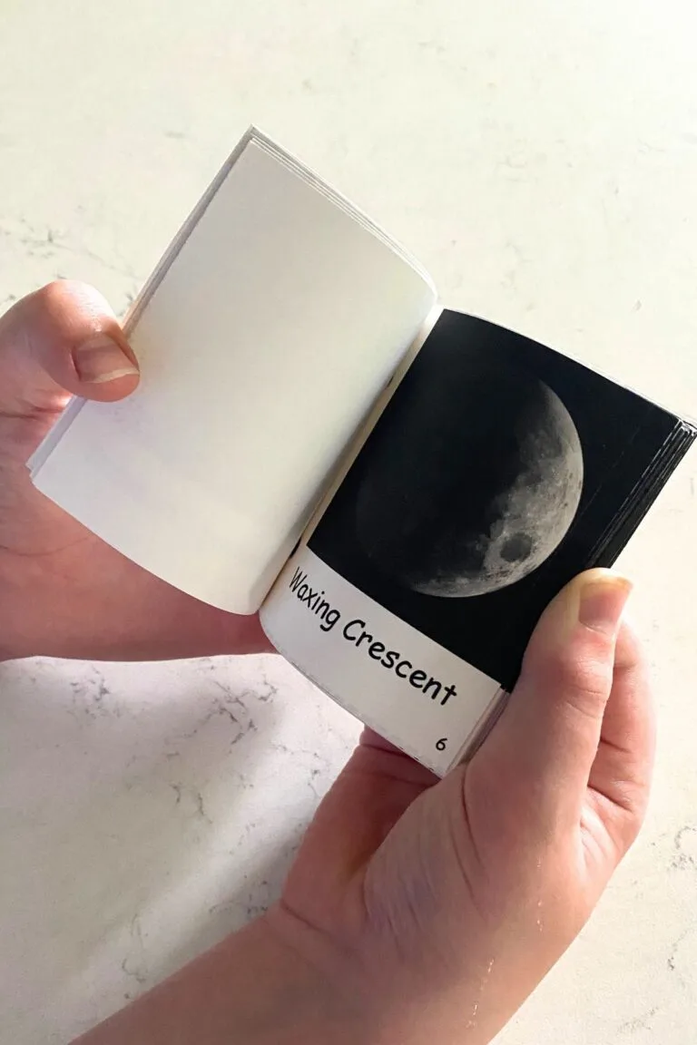 Εκτυπώστε σε χαρτόνι, κόψτε, ενώστε με συνδετήρες και ξεφυλλίστε γρήγορα για να δείτε το φεγγάρι να αλλάζει φάσεις.