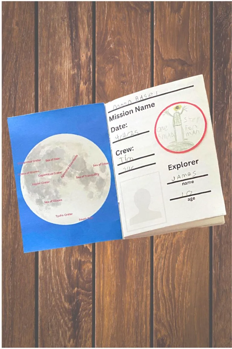 Φτιάξτε ένα μικρό βιβλιαράκι με χάρτη του φεγγαριού, «επισκεφθείτε» γνωστά σημεία με κιάλια και σφραγίστε το διαβατήριο κάθε φορά που τα εντοπίζετε.