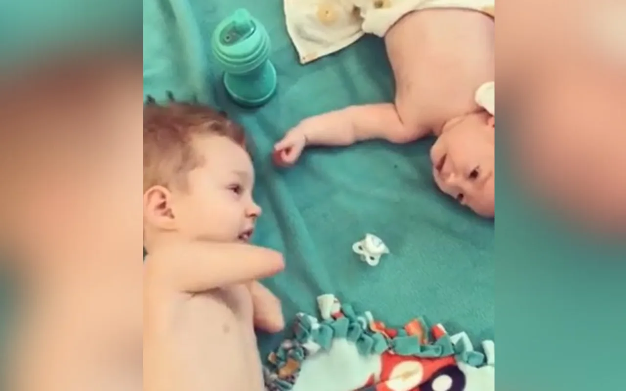 Στα λίγα δευτερόλεπτα που διαρκεί, βλέπουμε ένα μικρό αγόρι, που δεν έχει χέρια από τον αγκώνα και πάνω, να προσπαθεί με πείσμα να δώσει την πιπίλα στο μωρό αδελφάκι του, για να το βοηθήσει να ηρεμήσει.