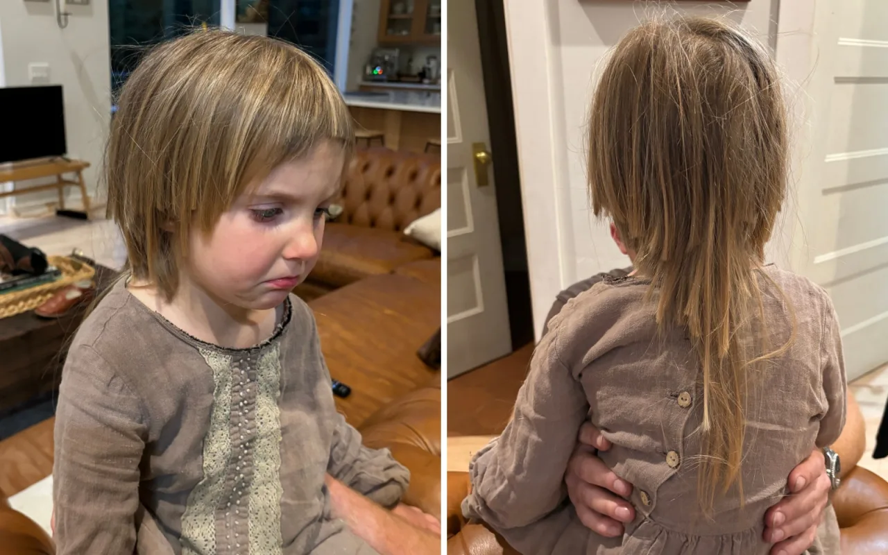 Η μικρούλα είχε κόψει λίγο χάλια τα ξανθά μαλλάκια της σε ένα κοντό καρέ μπροστά και πίσω κρέμονταν πιο μακριές τούφες, ενώ έλειπαν αρκετά μαλλιά από τη φράντζα της.
