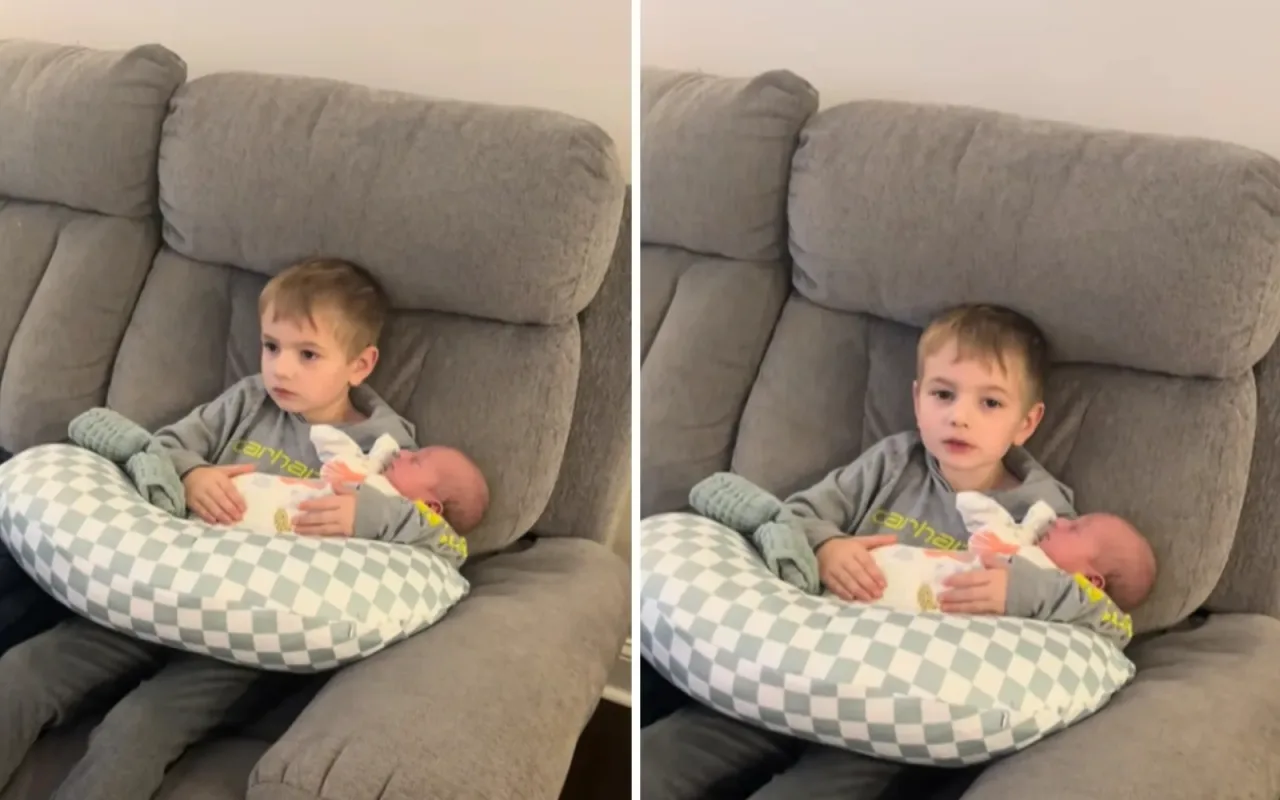 Ο Κένζι, που δεν αποκάλυψε το επώνυμό του, ανάρτησε στο TikTok ένα βίντεο τη στιγμή που μπαίνει στο σαλόνι και βρίσκει τον μεγαλύτερο γιο του, τον Κόα, να κρατά στην αγκαλιά του το νεογέννητο αδερφάκι του στον καναπέ.