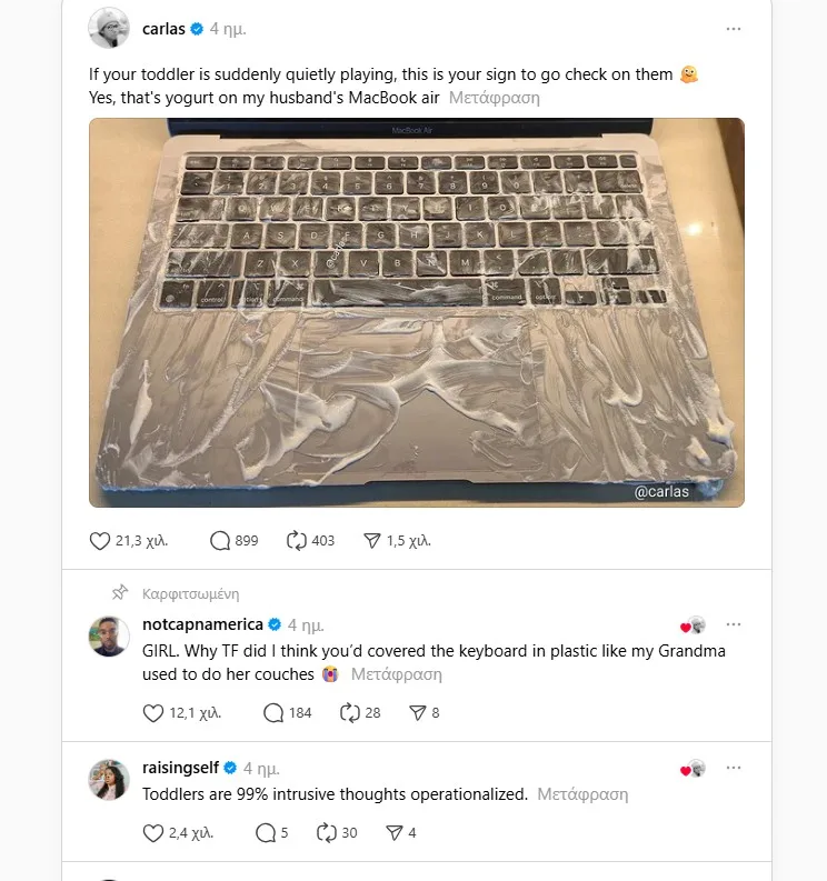 Το περιστατικό, που ανέβασε στο Threads, μία μαμά στις 9 Νοεμβρίου, έγινε viral ακριβώς επειδή περιγράφει το κλασικό γονεϊκό σενάριο: απόλυτη ησυχία = επερχόμενη καταστροφή. Η ανάρτηση, στην οποία το MacBook Air φαίνεται κυριολεκτικά αλειμμένο στο γιαούρτι, έχει μαζέψει πάνω από 21.000 likes και εκατοντάδες ξεκαρδιστικά σχόλια.