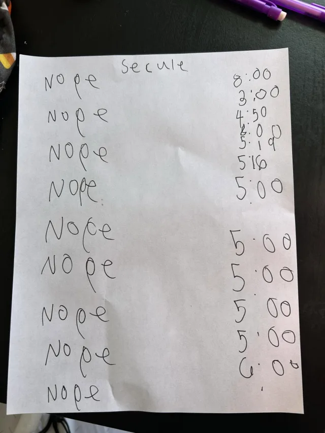 Αντί όμως η 8χρονη να συμφωνήσει ή έστω να το συζητήσει, απάντησε «Άσε με να δω λιγάκι το πρόγραμμά μου» και έφυγε τρέχοντας. Λίγο αργότερα επέστρεψε κρατώντας ένα χειρόγραφο χαρτί .. που έκανε το διαδίκτυο να λυθει στα γέλια. Το πρόγραμμα ήταν φαινομενικά γεμάτο: από «Nope 8:00» μέχρι «Nope 3:00», «Nope 4:50», «Nope 5:19» και μια σειρά από αποφασιστικά «nope» μέχρι τις 6 το απόγευμα, δεν υπήρχε ούτε λεπτό διαθέσιμο για δουλειές του σπιτιού.